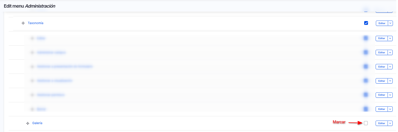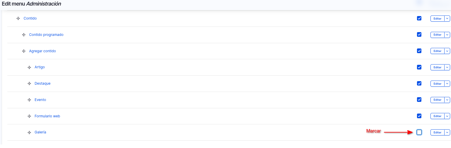 - Ir a Estructura > Menús > Administración e ahí buscar os termos Galería do submenú Contido > Agregar contido e facelos visibles (neste momento están desmarcados).
