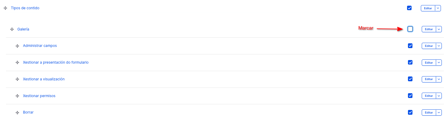 - No submenú Estrutura > Tipos de contido buscar Galería e activar.