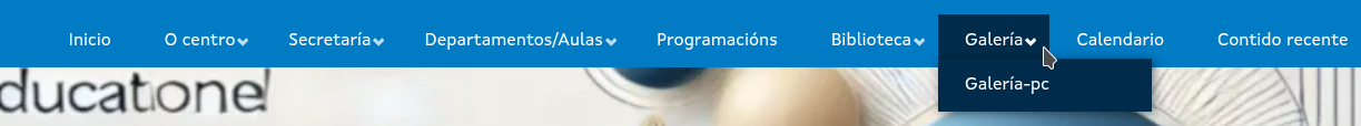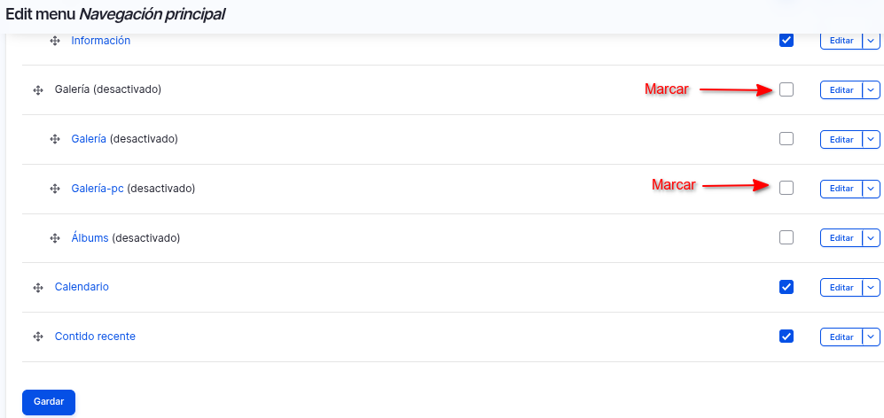 - Para que se amose no menú Navegación principal un enlace á Galería, ir a Estructura > Menús > Navegación principal e buscar o submenú Galería e activar así como o chamado Galería-pc.