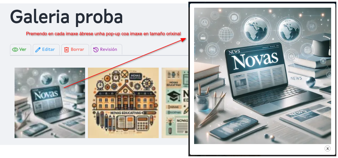 - Se se preme encima do título do contido amósanse todas as imaxes (en miniatura) dese contido en formato grella, premendo en cada imaxe amósase en tamaño orixinal.