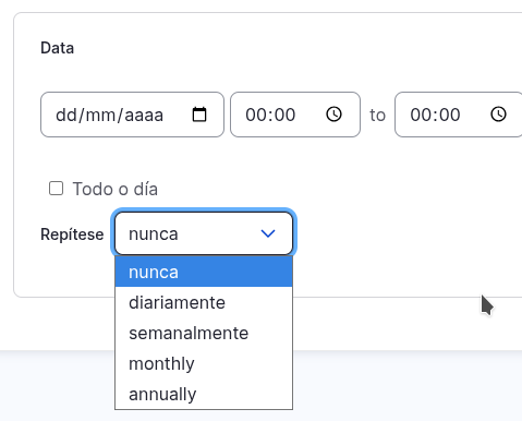 Ademais, existe a posibilidade de especificar eventos por día completo (Todo o día) ou con carácter periódico (Repítese).
