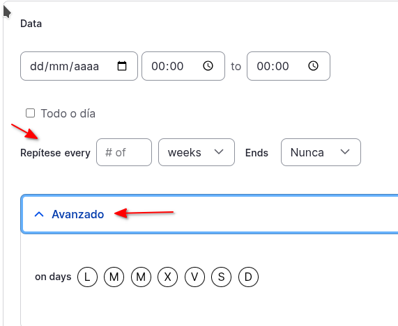 No caso de seleccionar algunha opción en Repítese, amosarase unha lapela Avanzado con opcións de especificación da periodicidade.