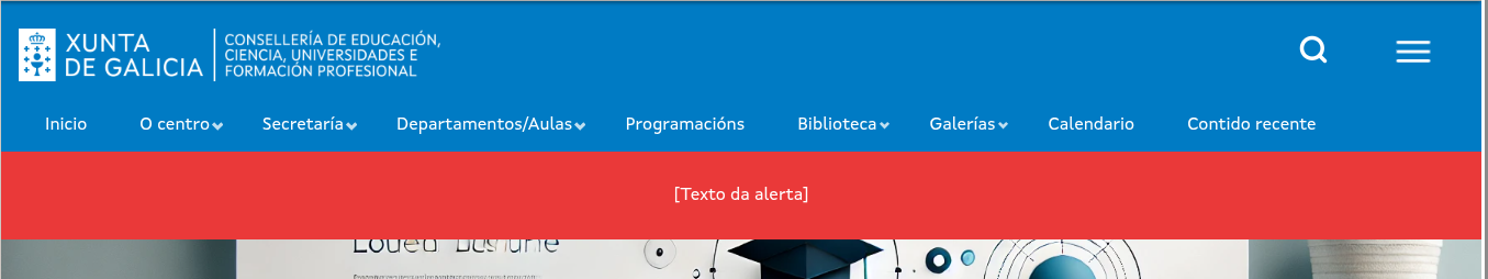 Os usuarios co rol editor principal do sitio poden poden activar un bloque de alertas predefinido, inicialmente desactivado, situado entre o menú de navegación principal e a zona de Destaques.