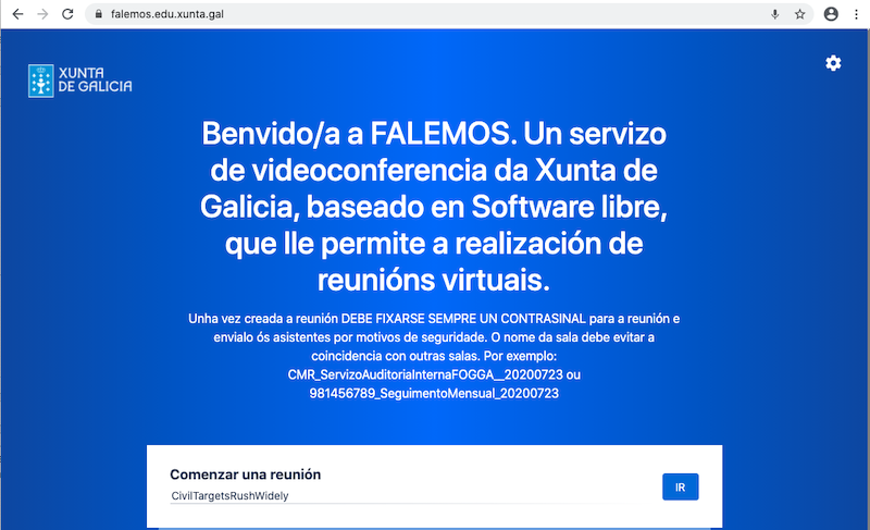 “FALEMOS Edu” é unha das aplicacións empregadas na Xunta de Galicia baseada no software libre JITSI para realizar reunións virtuais, reunións de coordinación, sesións de docencia, ... garantindo en todo momento a confidencialidade e seguridade nas comunicacións.