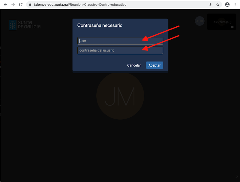 Despois de pulsar sobre o botón IR, se somos o afintrión da reunión, deberemos introducir o nome de usuario e contrasinal corporativos para poder crear a sala.