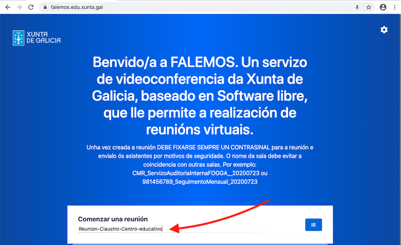 - Accede a https://falemos.edu xunta.gal, rexistra o nome da sala e preme o botón IR.