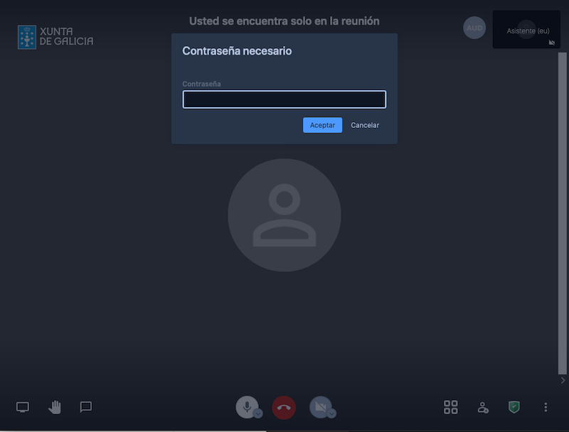 No caso de que a sala teña configurado un contrasinal de acceso, o usuario candidato a participante deberá pulsar sobre o botón de introducir un contrasinal e finalmente pulsar o botón "Aceptar".