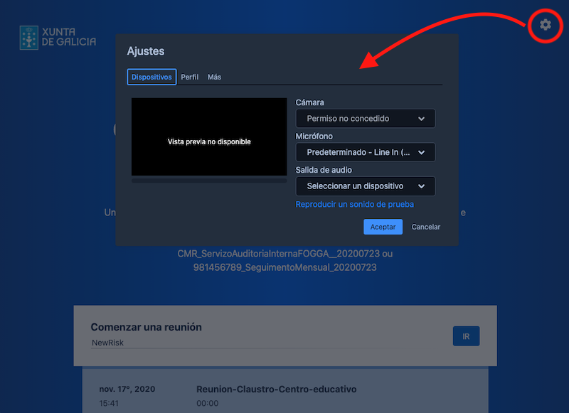 Cos distintos despregables podes escoller os dispositivos de son e vídeo que usarán para a videoconferencia no caso de que algún deles non o detecte automaticamente a plataforma.