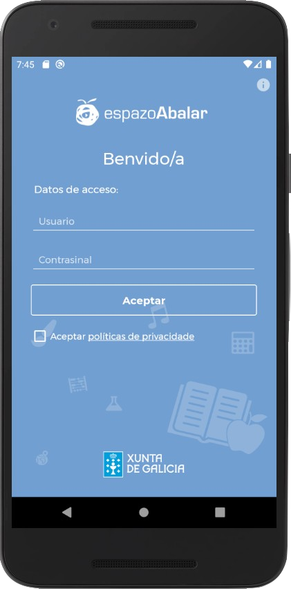 Unha vez descargada a aplicación abalarPro, o primeiro paso será introducir as credenciais corporativas e activar as políticas de privacidade, que se poden ler antes premendo na ligazón.