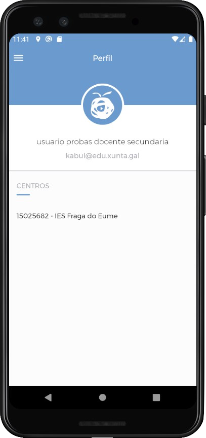Pantalla do perfilA primeira das pantallas que se amosan é a de perfil do/a docente, desde a cal se pode ver o nome de usuario, o correo electrónico, e a listaxe de centros do/a profesor/a.Tamén se terá acceso ao menú lateral de opcións premendo o botón situado na parte superior esquerda. |