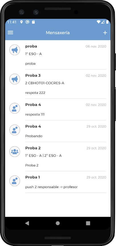 As mensaxes enviadas polo profesorado móstranse con fondo azul.