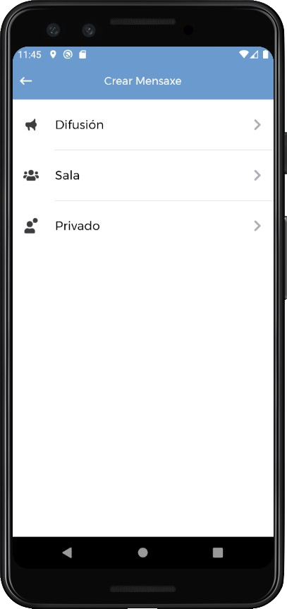 Ao escoller crear un chat privado, primeiro hai que localizar o grupo ao que pertence o usuario co cal queremos abrir unha conversación privada.
