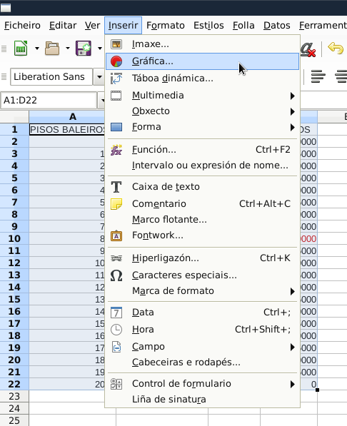 D. Seguidamente engadimos un gráfico. Seleccionamos todos os datos e logo clic en Inserir > Gráfica