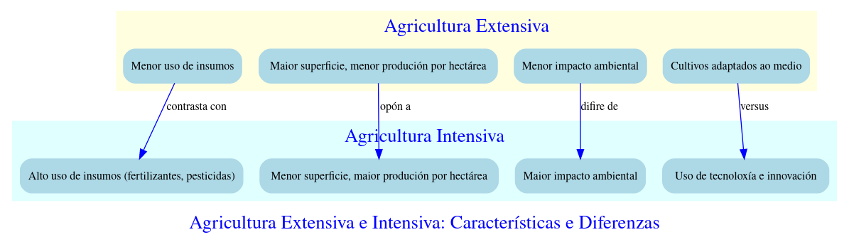 Como un experto en decoración con DOT, crea un mapa conceptual en linguaxe DOT cunha organización en clustering de nivel 2 do seguinte tema: “A agricultura extensiva e intensiva. Características, diferencias” Ademais, procura utilizar elementos decorativos de DOT para dotar ao mapa dun aspecto profesional. Inclúe tamén verbos nas relacións para facer máis claro o mapa conceptual, ao estilo de CmapTools. Engade os conceptos básicos e despois vai ramificando e expandindo a información de maneira esquemática. Detalla os pasos xerais para a montaxe dos primeiros elementos. Ademais, engádelle un título ao mapa para mellorar a súa estética.