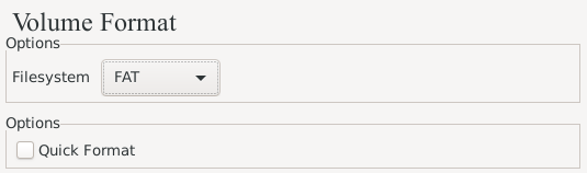 Se non imos almacenar ficheiros grandes, escollemos a opción No en Large Files. E en Volume Format seleccionamos FAT se desexamos abrir tamén a unidade nun sistema operativo Windows.