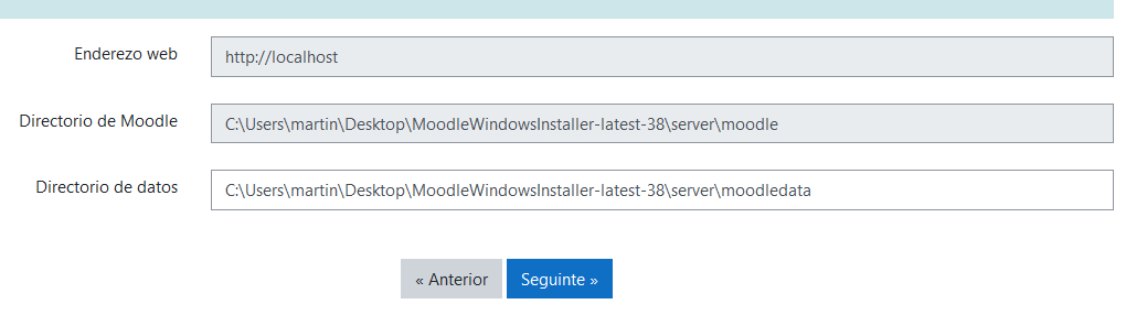 Na seguinte pantalla o sistema amósanos as rutas nas que se vai instalar o moodle e o moodledata. Non temos que modificar nada. Tan só prememos en Seguinte.