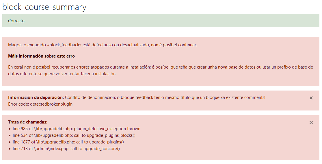 E remata así, o que nos fai pensar que non funciona, pero non é certo. Se volvemos a escribir na barra de direccións localhost, e seguidamente en Continuar aparecerá unha fiestra cos plugins. Se baixamos ata o final da páxina atoparemos un botón coa lenda "Upgrade Moodle database now" no que premeremos