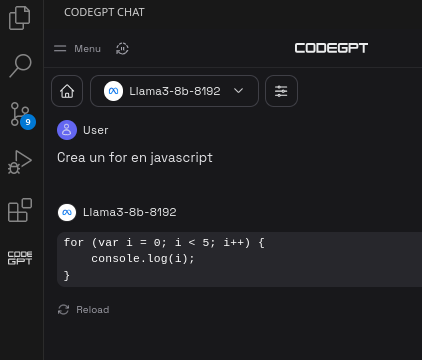 Paso 4. en CodeGPT escollemos de Provider Groq, e como modelo Llama3-8b-8192 e pegamos a key que xeramos no paso 2