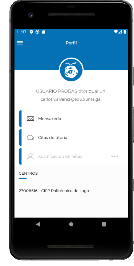 A primeira das pantallas que se amosa é a de perfil do/a docente, desde a que se pode ver o nome de usuario, o correo electrónico e o centro ou centros no que estará o/a docente.