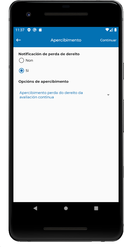 Unha vez seleccionado o grupo, e sempre que estea permitido, poderase seleccionar a opción de apercibimento. A continuación seleccionarase unha das opcións que ofrece o despregable.