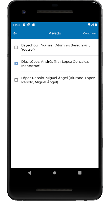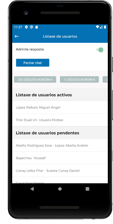 Unha vez elixido o grupo e o apercibimento, será posible ver a listaxe de usuarios do mesmo e poderase escoller aos usuarios. Poderemos crear tantos chats privados como usuarios se seleccionen neste paso.