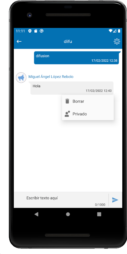 Para levar a cabo esta acción deberase acceder a un chat de tipo Difusión ou Sala, e premer de maneira prolongada sobre a mensaxe da persoa coa que queremos abrir un chat privado. Deste xeito amosarase a opción de Privado nun menú contextual.