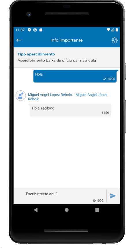 Información de apercibimento, que se amosará na parte superior do chat de maneira fixa e indicará cal é o tipo de apercibimento que o docente marcou para o/a alumno/a. No caso de non haber ningún tipo de apercibimento esta información non se amosará.