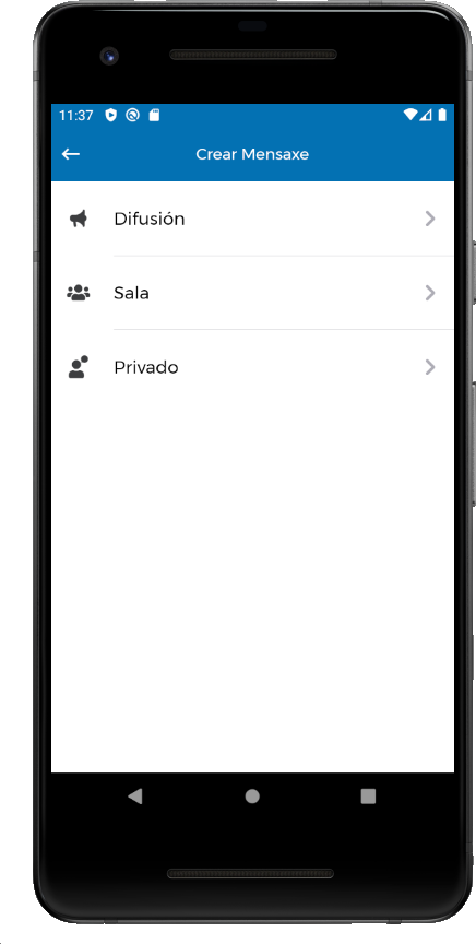 Na seguinte pantalla débese elixir o tipo de chat que se quere crear: Difusión, Sala, ou Privado.