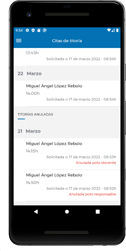 As titorías anuladas son citas que estaban pendentes de confirmar ou que xa estaban confirmadas e que, por algún motivo, foron anuladas. Esta anulación pode levala a cabo tanto os docentes como os/as responsables.