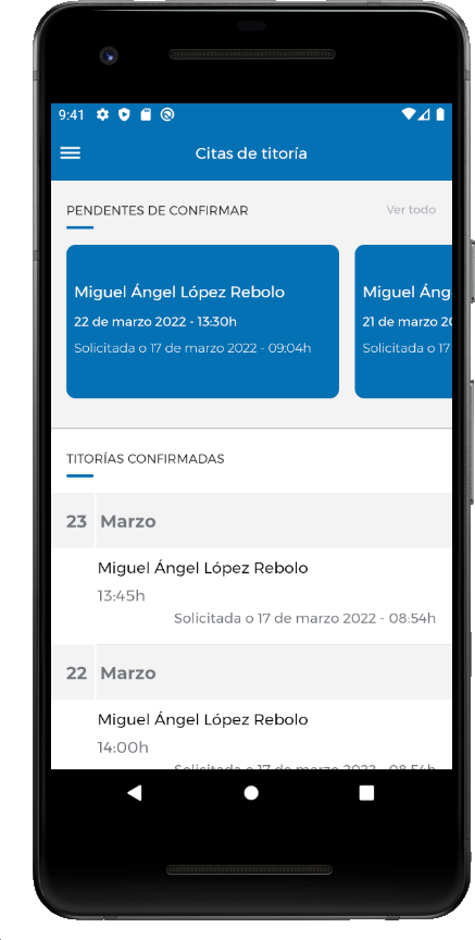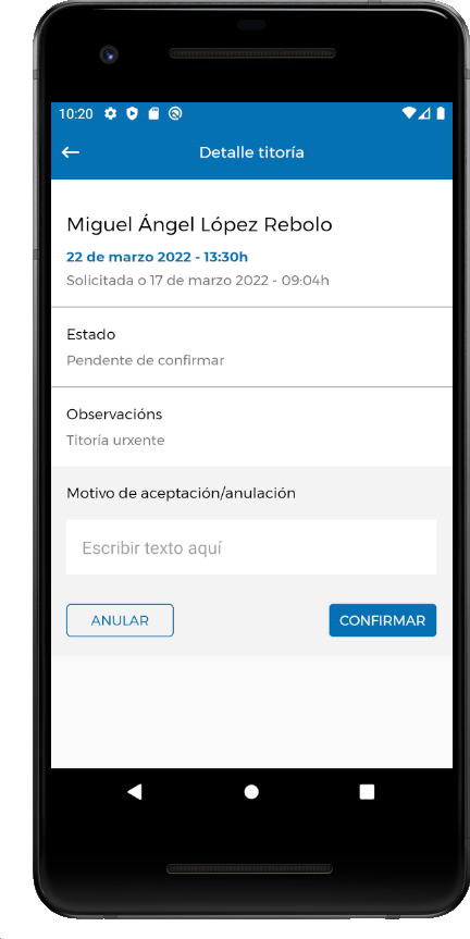 Para confirmar unha cita de titoría o primeiro paso é seleccionala na sección “Pendentes de confirmar” pulsando sobre ela e accedendo ao detalle da mesma.