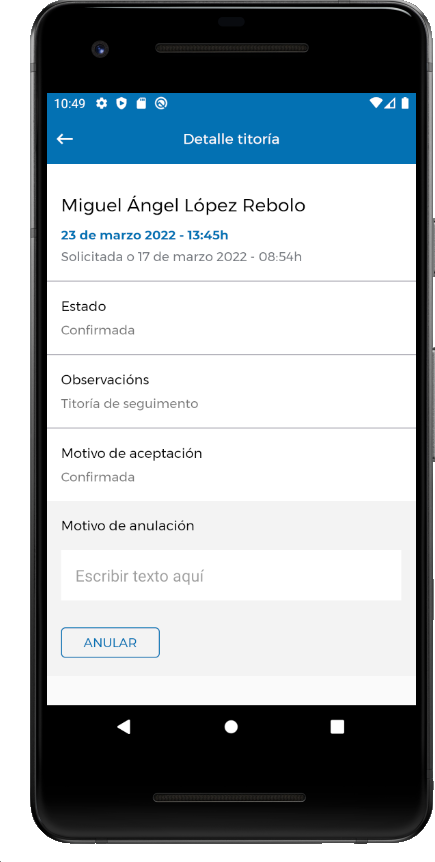O proceso de anulación de titorías é moi similar ao de confirmación. Para anular unha cita poderase seleccionar unha titoría pendente de confirmar ou unha titoría confirmada.
