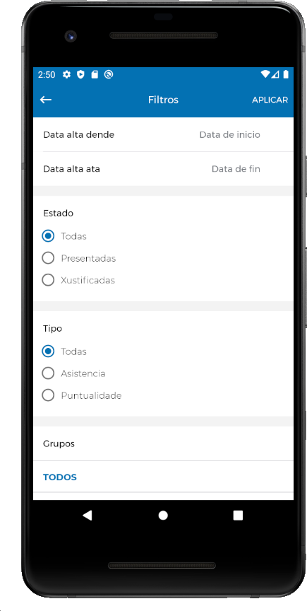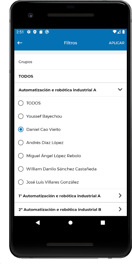 Seleccionar un grupo específico polo que filtrar: TODOS: amosa todos/as os/as alumnos/as do grupo ou poderase seleccionar por alumno/a individualmente.