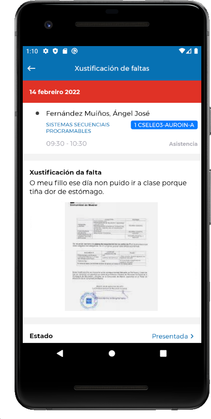 Pola contra, unha falta presentada indica que o xustificante foi enviado polos responsables pero que non foi validada polo docente e, polo tanto, a falta non está xustificada.