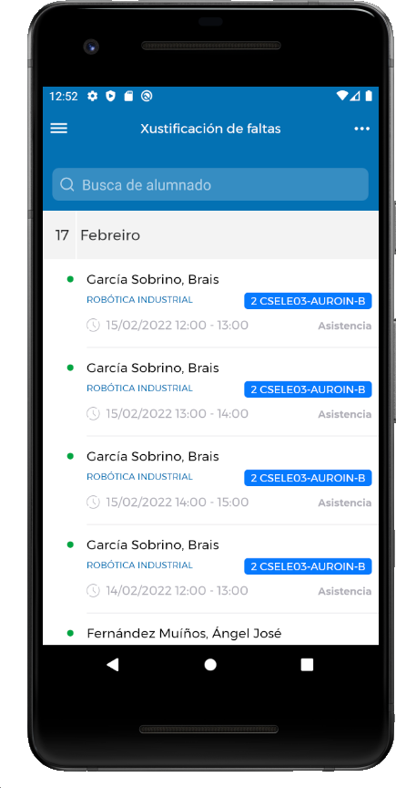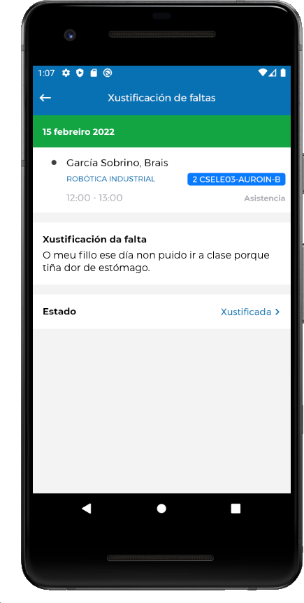 Izq: Data na que se presentou o xustificante. Nome do/a alumno/a e materia da falta. Data e hora da falta.