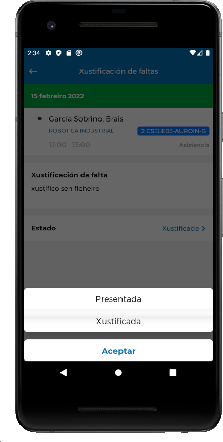 Cambiar o estado da falta a “Xustificada” ou a “Presentada”