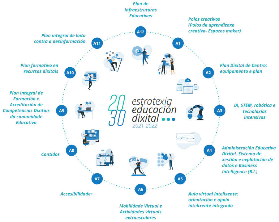 Organízase en torno a 12 accións de impacto: a dotación, o Plan Dixital de centro, o traballo con IA, STEM, robótica e tecnoloxías intensivas, o desenvolvemento da administración educativa dixital, polos creativos, as aulas virtuais intelixentes, mobilidade virtual e actividades virtuais extraescolares, a accesibilidade universal, contidos dixitais, un plan integral de formación e acreditación de competencias dixitais da comunidade educativa, un plan formativo en recursos dixitais, un plan integral de loita contra a desinformación e un plan de infraestruturas educativas.