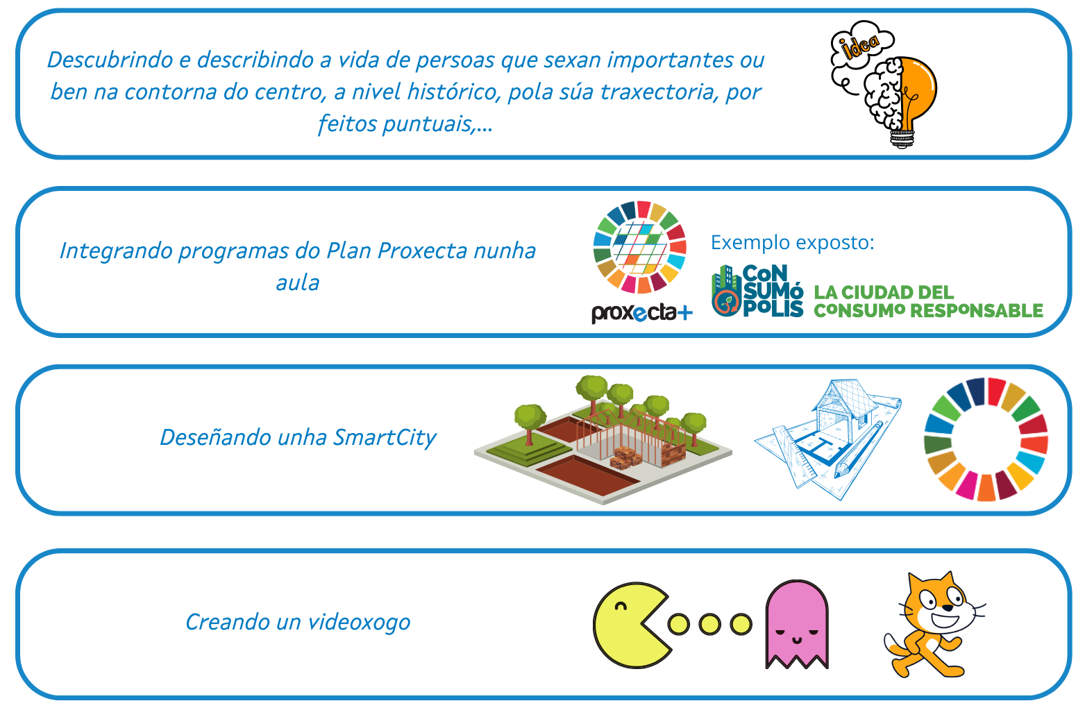 Ademais dos recursos editoriais, recurso cREAgal, DIXIT e dos materiais do Repositorio de contidos, pódense desenvolver proxectos e retos para os que estes materiais poden servir de apoio. A continuación amósanse algunhas posibilidades nas que dispoñer dos recursos do proxecto facilita e enriquece o proceso de ensino - aprendizaxe.
