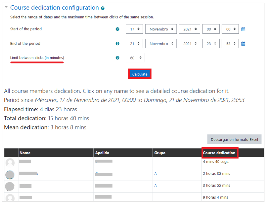Premendo no botón do bloque accedemos a unha páxina na que é posible indicar as datas do periodo e o tempo límite entre clics para facer o cálculo. Se escollemos un alumno concreto móstrase ademais información detallada cos inicios de sesión e a duración das mesmas (entendendo por sesión o tempo transcurrido entre a primeira e a última pulsación dentro do tempo límite), así como do tempo medio adicado.