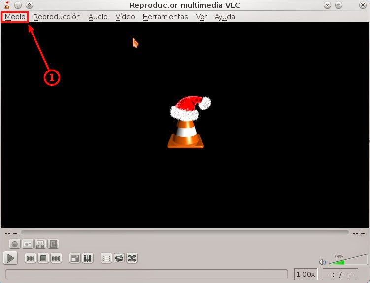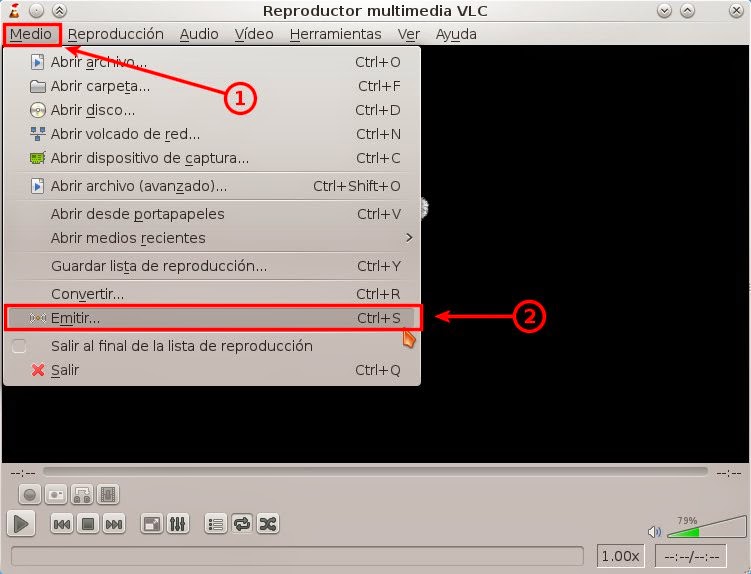 Unha vez instalado, executamos VLC e presionamos a combinación de teclas ctrl+ S ou ben nos imos ao menú: Medio > Emitir...