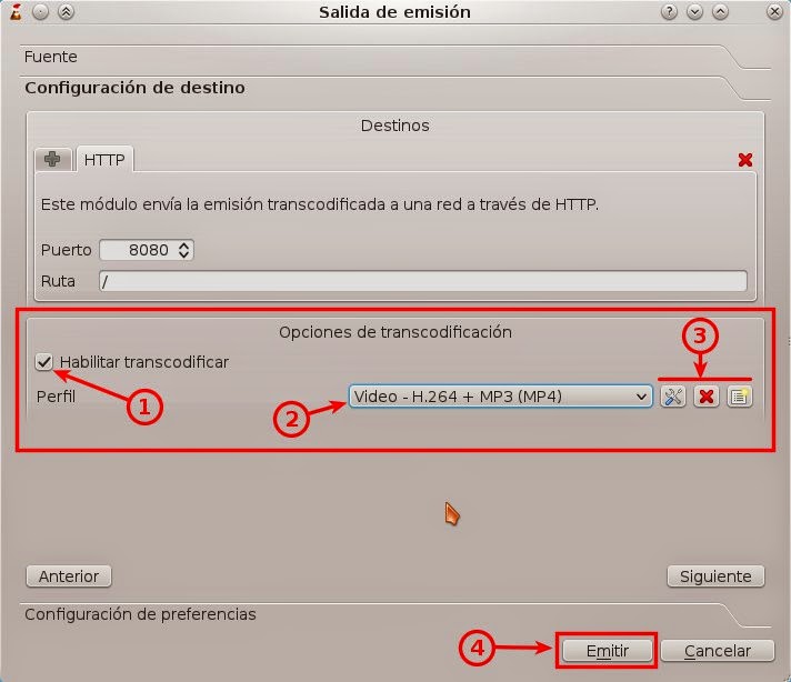 1- Habilitamos a transcodificación 2- seleccionamos o formato de audio e de vídeo que mais interésenos na nosa rede local, para que todos os equipos da nosa rede poidan reproducir o vídeo e o audio, ambos sen problemas. 3- Esta opción é: 3.1- Editar os formatos de vídeo e audio 3.2- Eliminar un formato previamente definido de vídeo e audio 3.3- Crear un formato definido de vídeo e audio