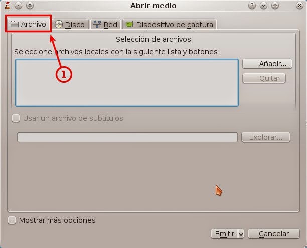 Sáenos unha xanela que nos deixa elixir o medio no que se atopa o noso contido multimedia, desde un Arquivo, desde un Disco, a través da Rede, ou desde un Dispositivo de captura como pode ser unha webcam, unha sintonizadora de TV.