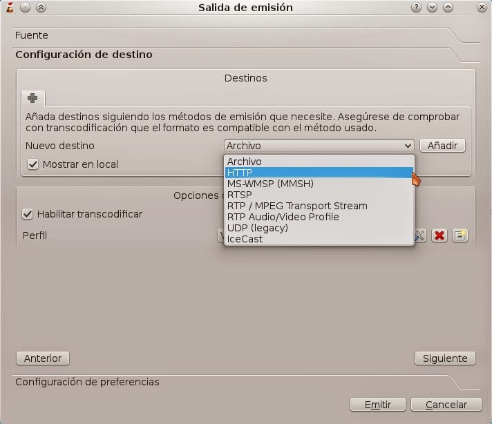 Marcamos mostrar en local. No menú despregable seleccionamos HTTP xa que imos emitir usando devandito protocolo e logo pulsamos Engadir:
